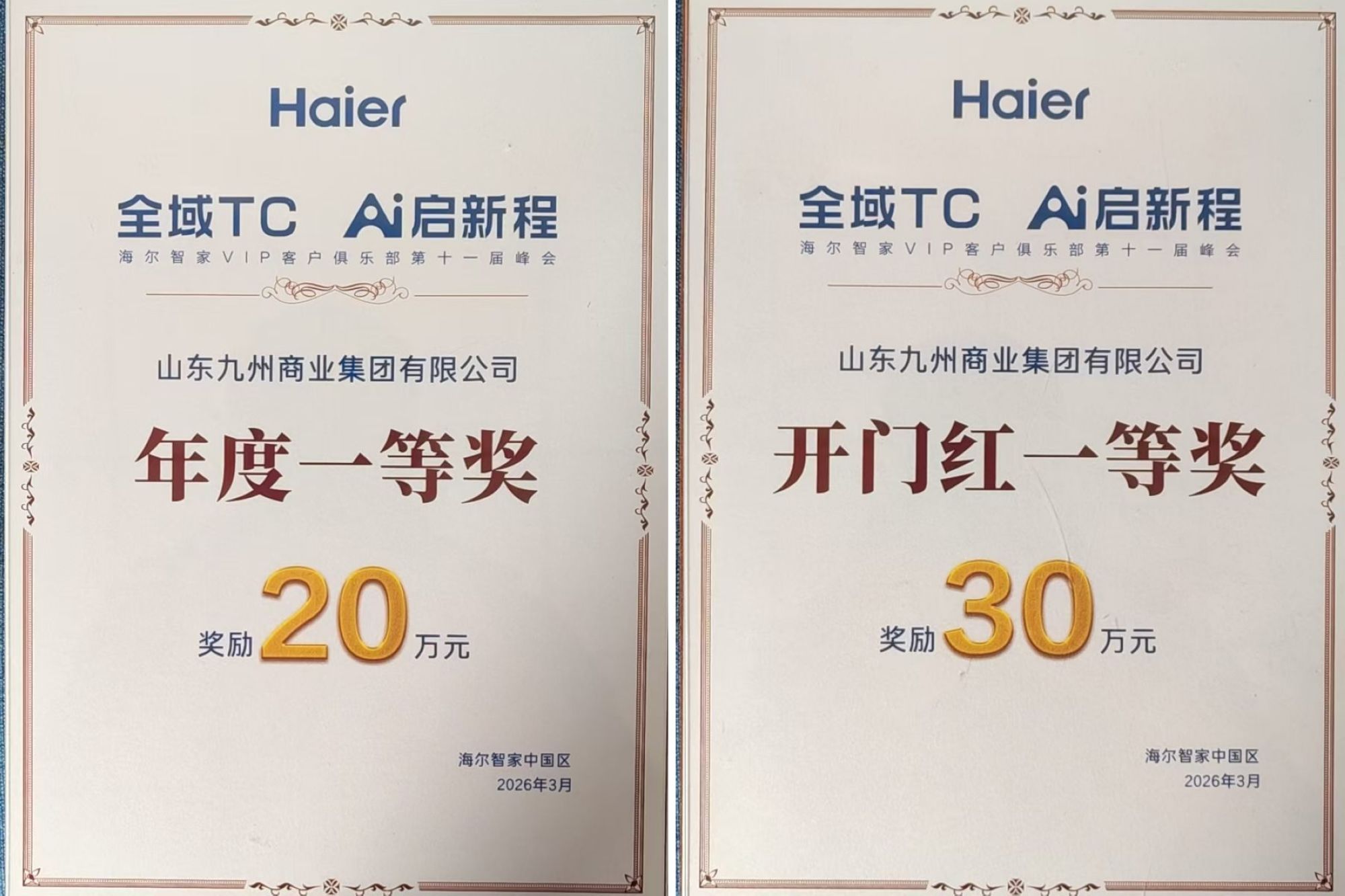 3月12日至15日,“全域TC AI啟新程”海爾智家VIP客戶俱樂部第十一屆峰會在上海召開。會上,九州家電憑借經(jīng)營團(tuán)隊(duì)的突出表現(xiàn),榮獲兩項(xiàng)獎項(xiàng):2025年度海爾智家VIP俱樂部C組一等獎(獎勵20萬元)、2026年度海爾智家VIP俱樂部開門紅一等獎(獎勵30萬元)。